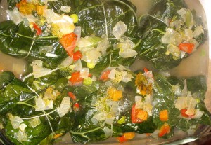 Aqui fica, não a receita propriamente… isso terão de encomendar directamente à Rita Rodrigues… mas o resultado da colheita já confeccionado! Embrulhinhos de couve que parecem uma verdadeira delícia.